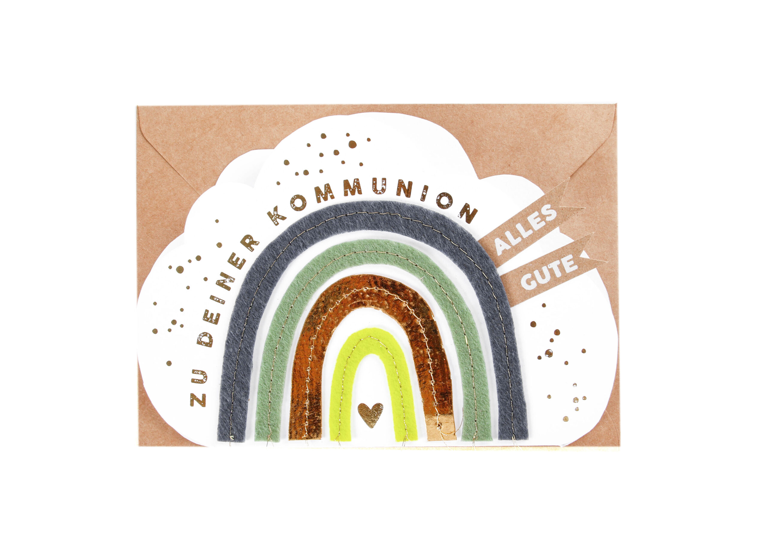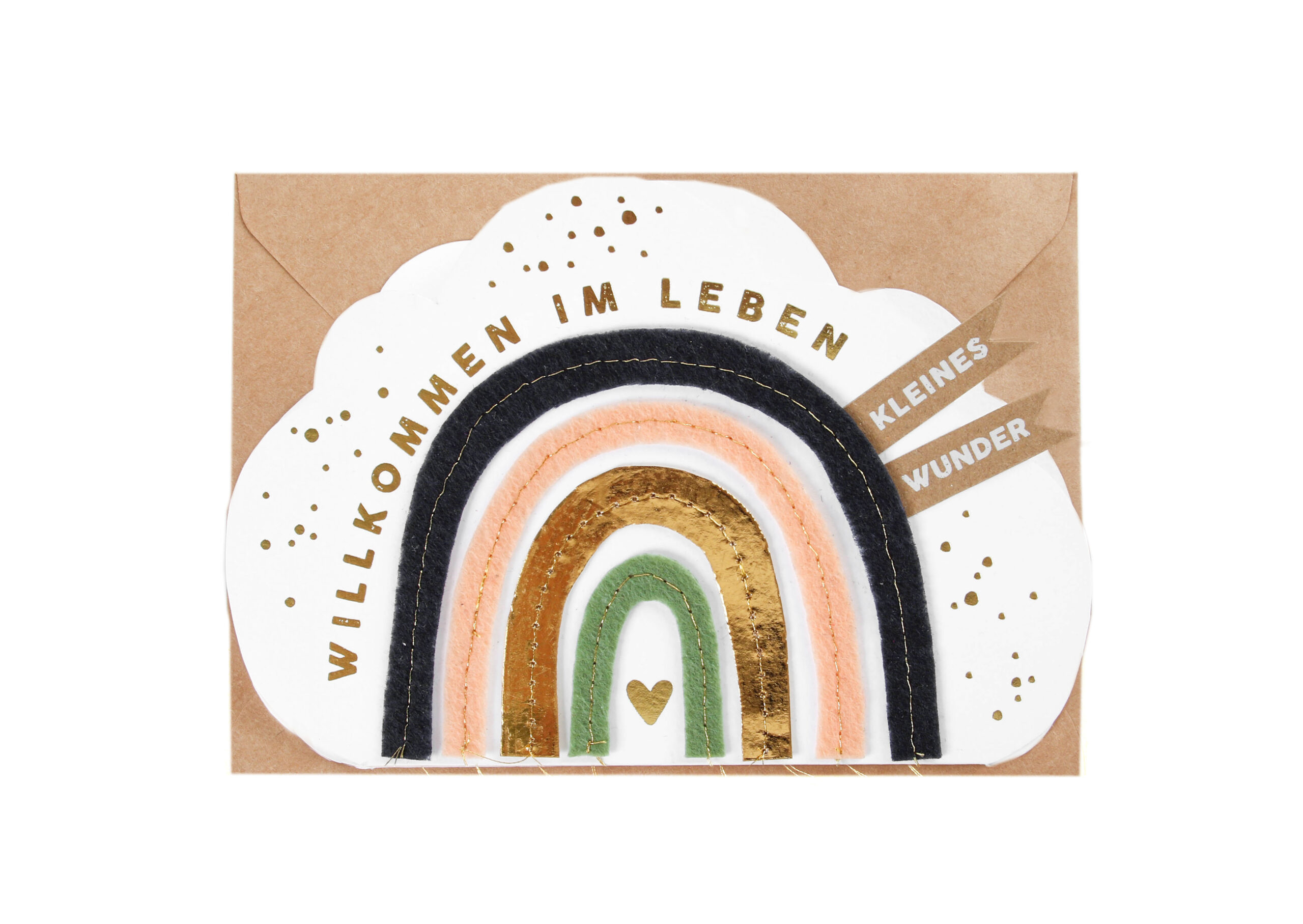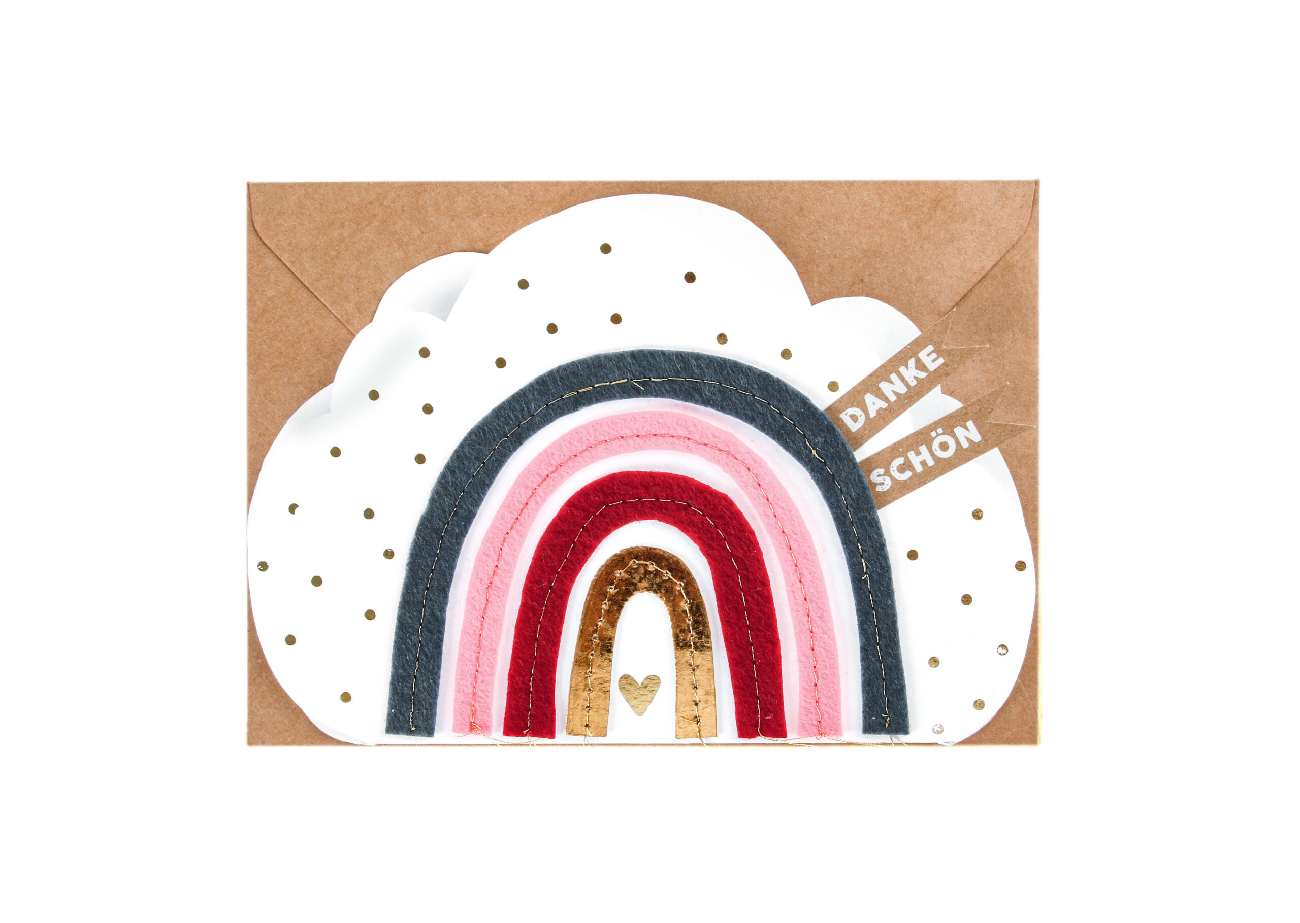 Am Ende des Regenbogens…ein Regenbogen hat immer etwas Lebensfreude und Wunder in sich. So auch bei dieser farbenfrohen Karte in Wolkenform mit aufgenähtem Filz und Papier. Ein farbenfroher Gruß an das schöne Leben.
