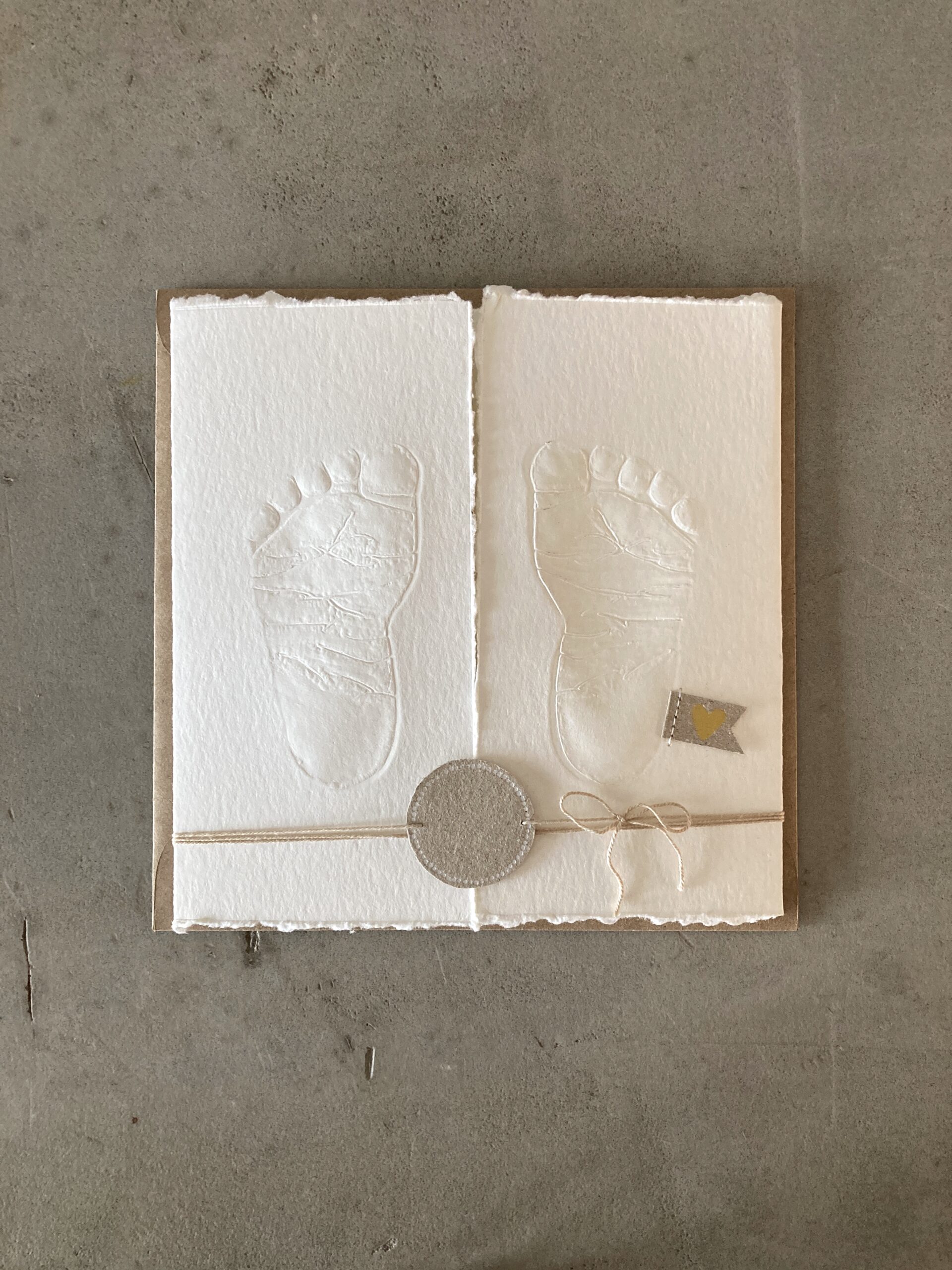 Karte aus handgeschöpften Papier mit Prägung zum Aufklappen, mit Einleger zum Beschreiben, Applikationen, Band und Umschlag
