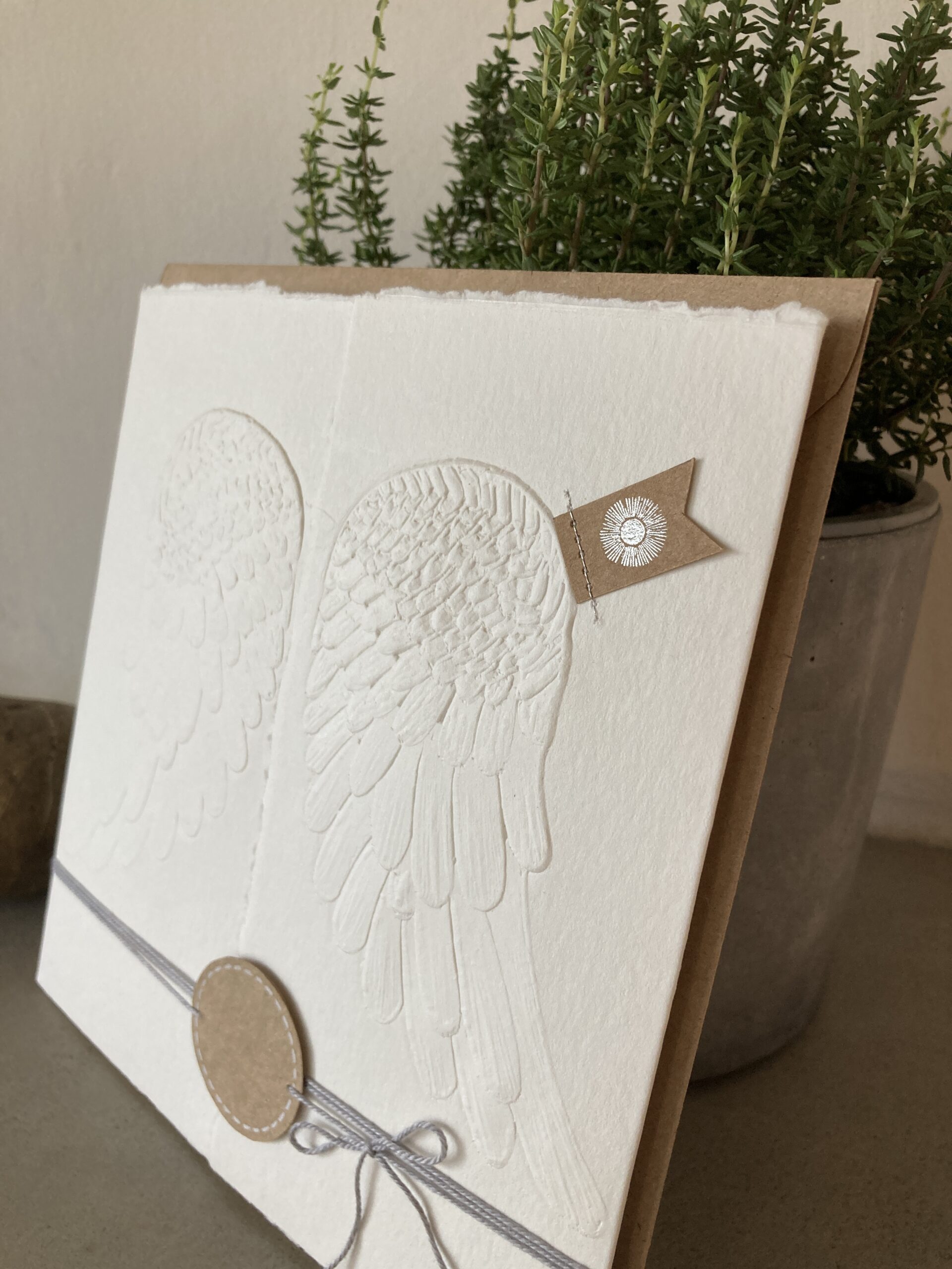 Eine besondere Karte aus feinem, handgeschöpften Papier mit Prägung. Auf den Papieranhänger an dem Band kann man Namen oder Datum schreiben. Innen ist eine Karte zum Beschreiben mit persönlichen Wünschen und Botschaften. Guter Stil vermischt mit etwas Wunder und ganz viel Detailliebe.